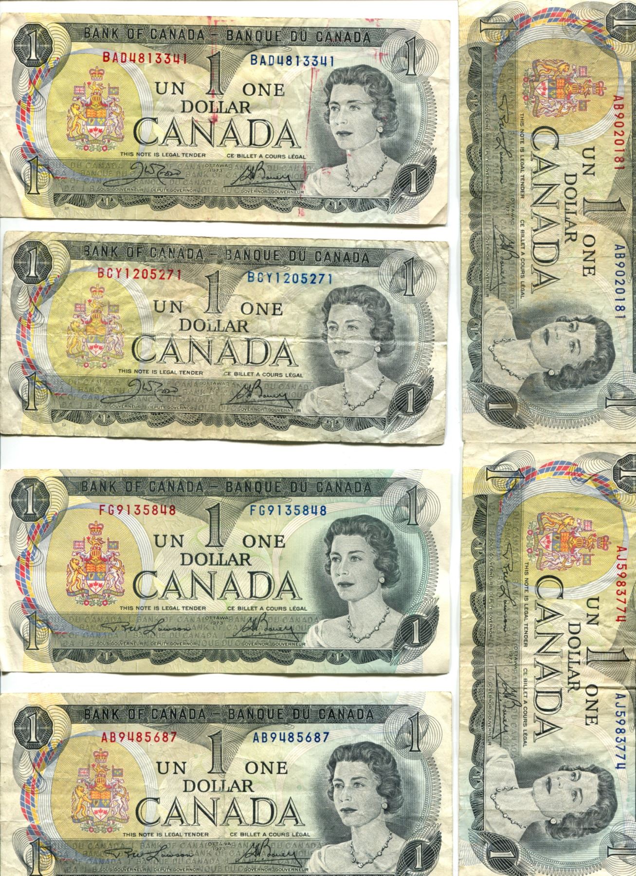 1973 Canada One Dollar Bills (9) 2 & 3 Letter Prefixes