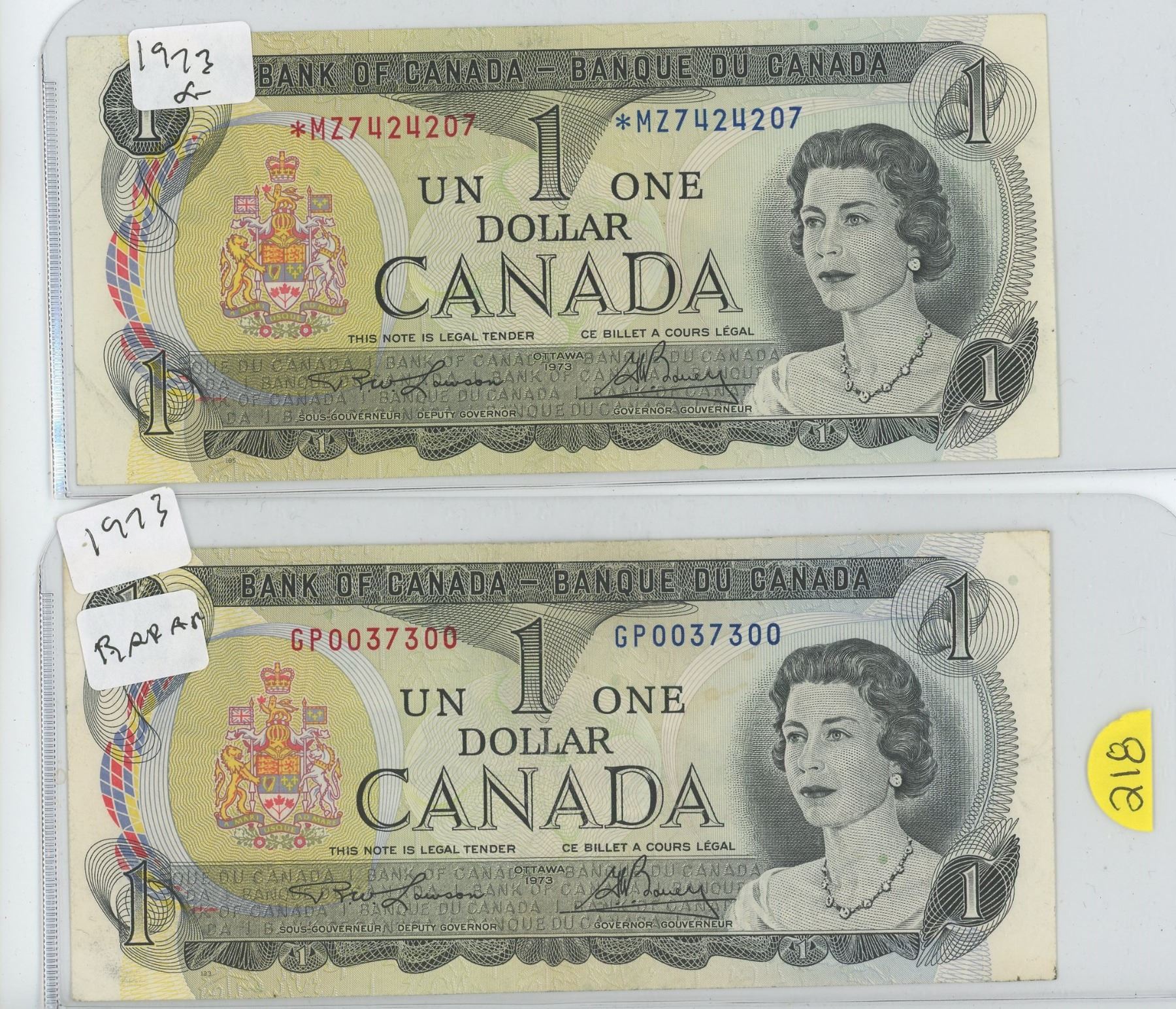 2 1973 Canadian 1 Dollar Bills (one has * serial ) Schmalz Auctions
