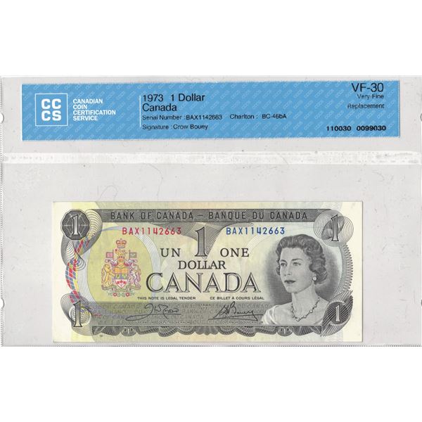 Canada One Dollar Bill (1) 1973; Replacement
